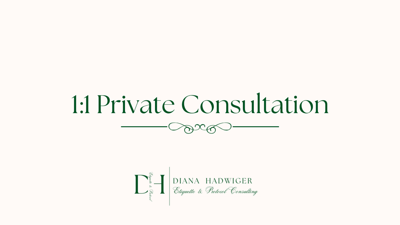 Please note that this is a non-refundable investment [except for in the case of emergencies which will be agreed on between the client and Diana Hadwiger Etiquette and Protocol Consulting LLC].